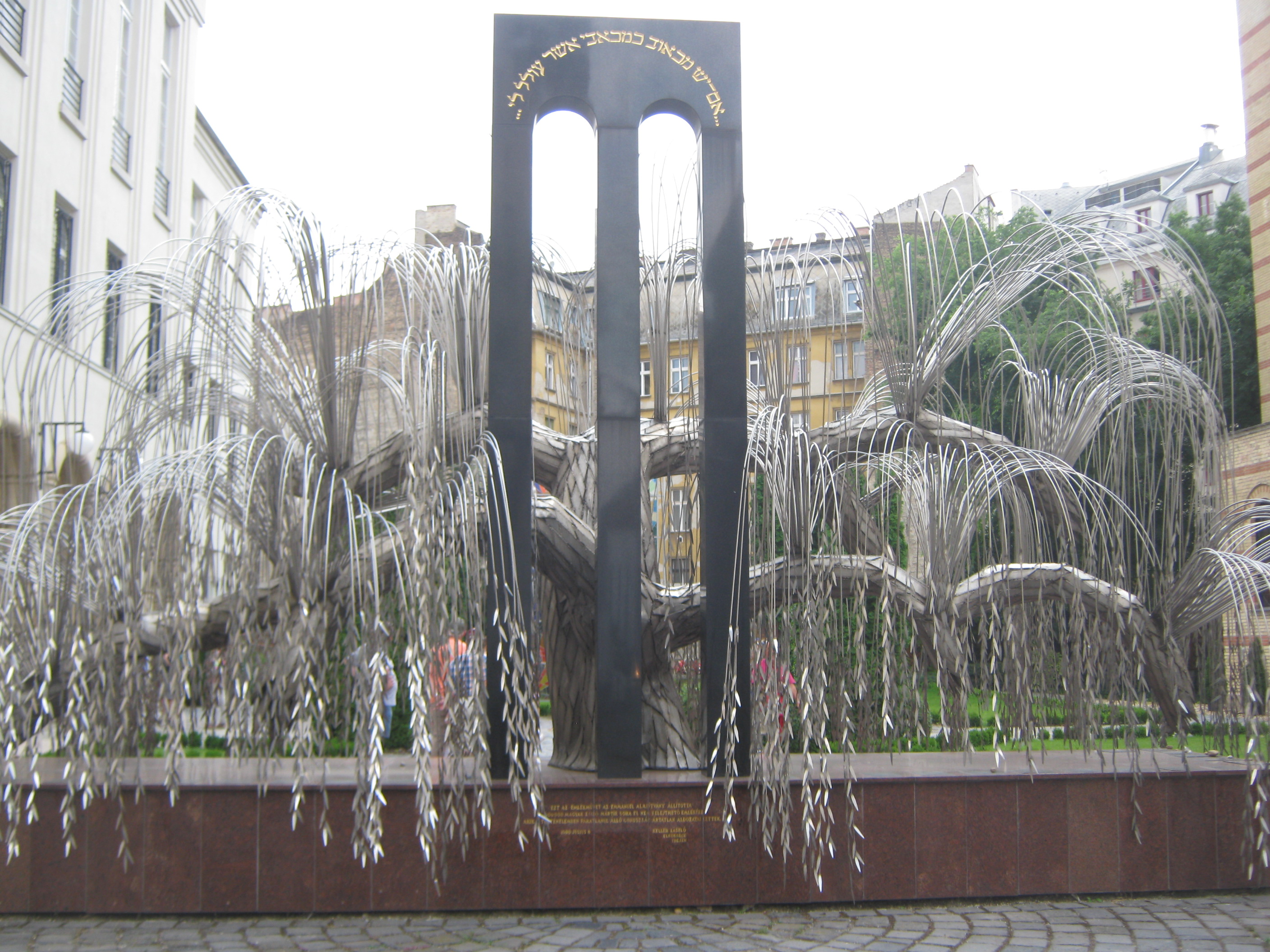 Cada folha da árvore tem o nome de um dos judeus mortos. Algumas não têm nome, são os que não foram identificados. Ao centro, a pedra preta, lembra aquelas que foram recebidas por Moisés com os mandamentos de Deus, só que não tem nada escrito, é vazado. Significa que tanta gente foi morta por causa da ignorância de outros tantos.